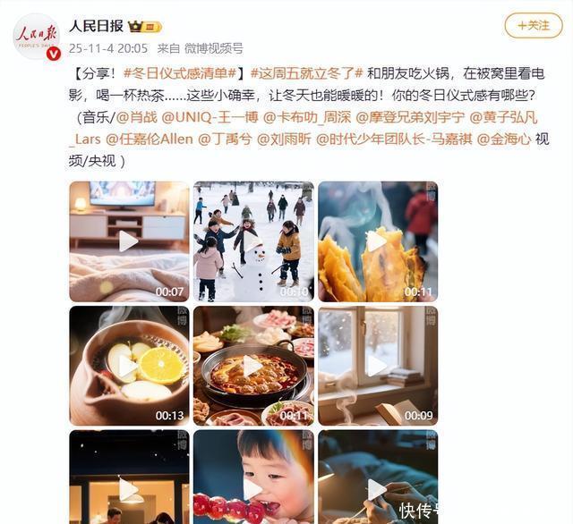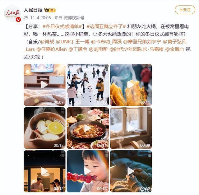 再谱华章 11月4日,人民日报发文庆祝即将到来的冬天。 在分享冬日仪式感清单时,人民日报还分享了丁禹兮的冬日仪式感音乐。