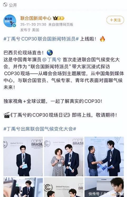 粉丝们纷纷在评论区留言“和丁禹兮的歌一起过冬”。 除此之外,联合国新闻中心也在11月20日发文祝贺丁禹兮。 原来他作为青年演员代表受邀参加了联合国气候变化大会。